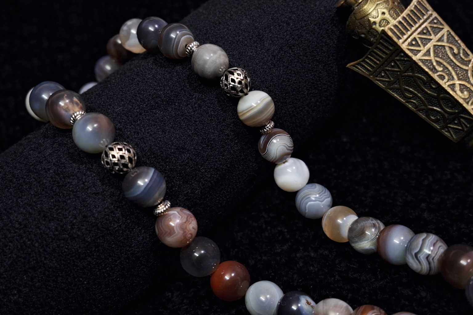 This rosary is meticulously crafted with the utmost precision, combining exceptional artistry and timeless elegance. The stunning Botswana Agate gemstone, paired with 925k sterling silver, creates a mesmerizing fusion of beauty and craftsmanship. Each bead of Botswana Agate is carefully selected for its unique color and texture, making each rosary a one-of-a-kind masterpiece.